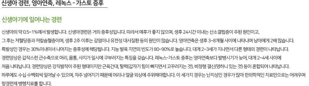 신생아의 약 0.5~1%에서 발생합니다. 신생아경련은 거의 증후성입니다. 따라서 예후가 좋지 않으며, 생후 24시간 이내는 산소결핍증이 주된 원인이고, 그 후는 저혈당증과 저칼슘혈증이며, 생후 2주 이후는 감염이나 유전성 대사질환 등의 원인이 많습니다. 영아연축은 생후 3~8개월 사이에 나타나며 남아에게 2배 많습니다. 특발성인 경우는 30%이내이녀 나머지는 증후성에 해당됩니다. 지능 발육 지연의 빈도가 80~90%로 높습니다. 대개 2~3세가 지나면서 다른 형태의 경련이 나타납니다. 경련양상은 갑작스런 근수축으로 머리, 몸통, 사지가 일시에 구부러지는 특징을 갖습니다. 레녹스-가스토 증후는 영아연축보다 발병시기가 늦어, 대개 2~4세 사이에 처음 나타납니다. 경련양상은 강직발작이 주된 형태이지만 근육간대, 탈력(갑자기 힘이 빠지면서 고꾸러지는 것), 비정형 결신(멍하니 있는 것) 등이 혼합되어 나타납니다. 하루에도 수십 수백회씩 일어날 수 있으며, 자주 넘어지기 때문에 머리나 얼굴 외상에 주위해야합니다. 이 세가지 경우는 난치성인 경우가 많아 한의학적인 치료만으로는 어려우며 항경련제 병행치료를 합니다.