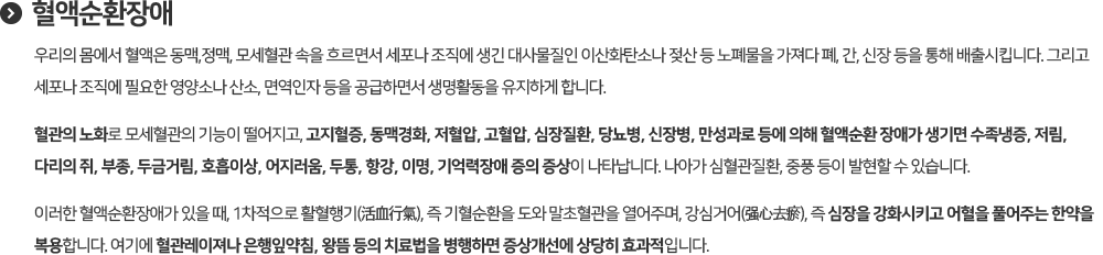 혈관의 노화로 모세혈관의 기능이 떨어지고, 고지혈증, 동맥경화, 저혈압, 고혈압, 심장질환, 당뇨병, 신장병, 만성과로 등에 의해 혈액순환 장애가 생기면 수족냉증, 저림, 다리의 쥐, 부종, 두금거림, 호흡이상, 어지러움, 두통, 항강, 이명, 기억력장애 증의 증상이 나타난다. 나아가 심혈관질환, 중풍 등이 발현할 수 있습니다.