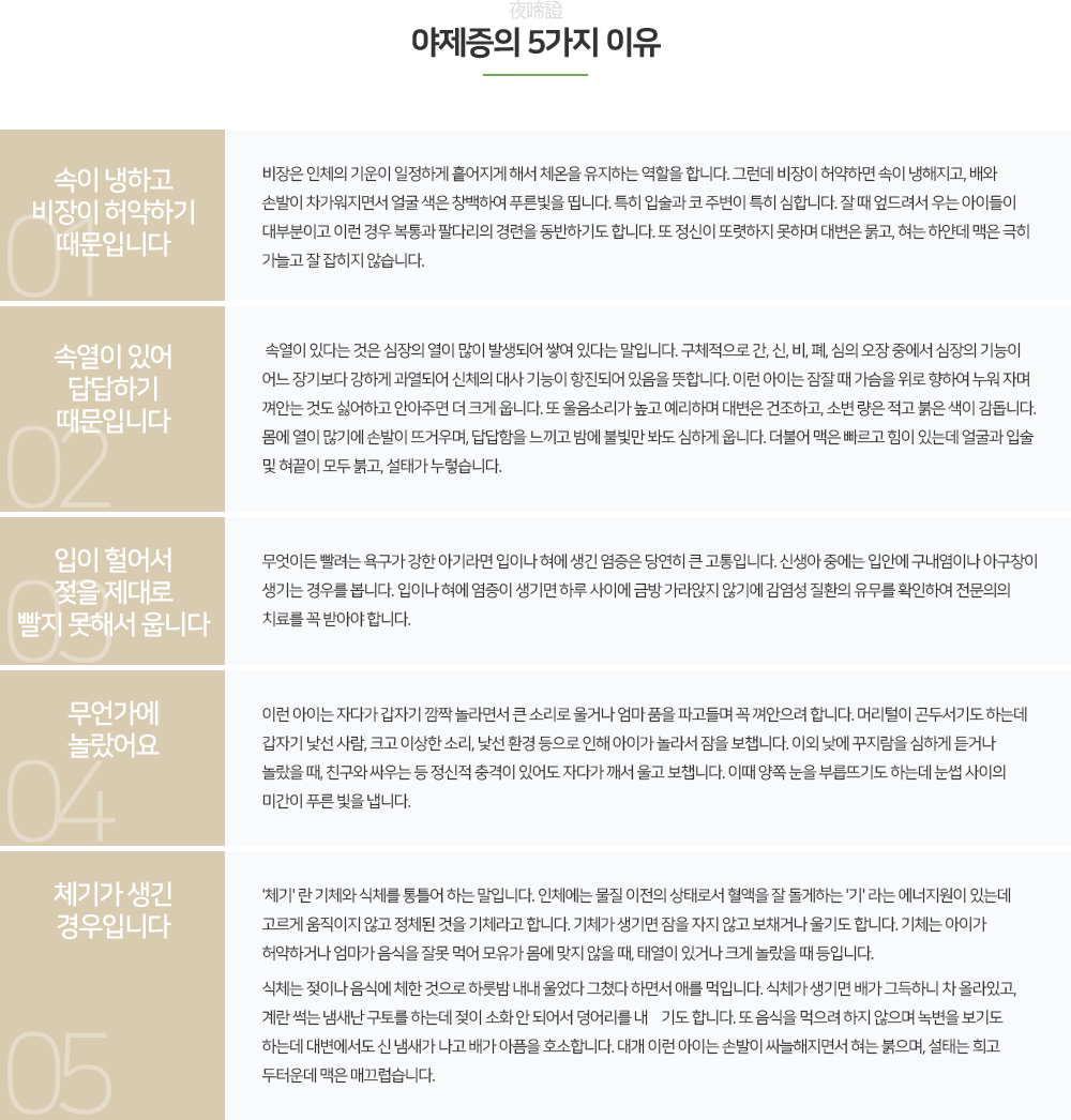 낮잠은 몇 시간씩 자면서 밤에는 칭얼대고, 낮엔 별 탈없이 지내다가도 밤만 되면 보채고, 자지러지게 우는 아이가 있습니다. 가벼울 때는 칭얼거리며 우는 정도지만 심할 때는 밤새 울기도 합니다. 경험이 많은 어른들은 "아직 어려서 그렇다. 조금 지나면 괜찮다"며 쉽게 말하지만 아이에게 맞추어 생활하는 엄마들은 밤이 무서울 지경입니다. 그러나 아이가 밤마다 보챌 때는 엄마 못지 않게 아이 또한 힘들고 아프다는 것을 알아야 합니다. 한방에서는 이런 경우를 소아야제(小兒夜啼)라고 하여 병으로 진단, 이를 치료하고 있습니다.